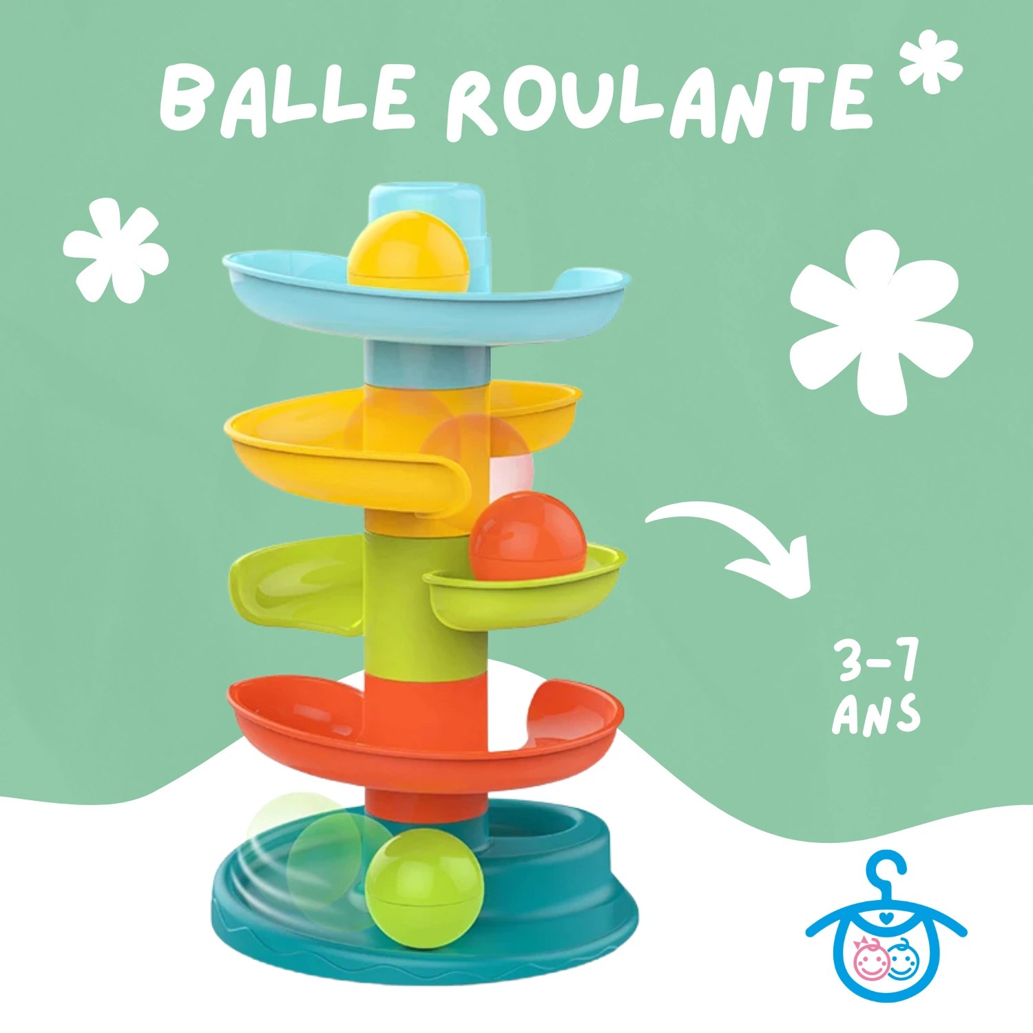 Jouets de développement en forme de tour avec balle roulante pour enfants : une tour tourbillonnante pour bébé où la balle tombe et roule.